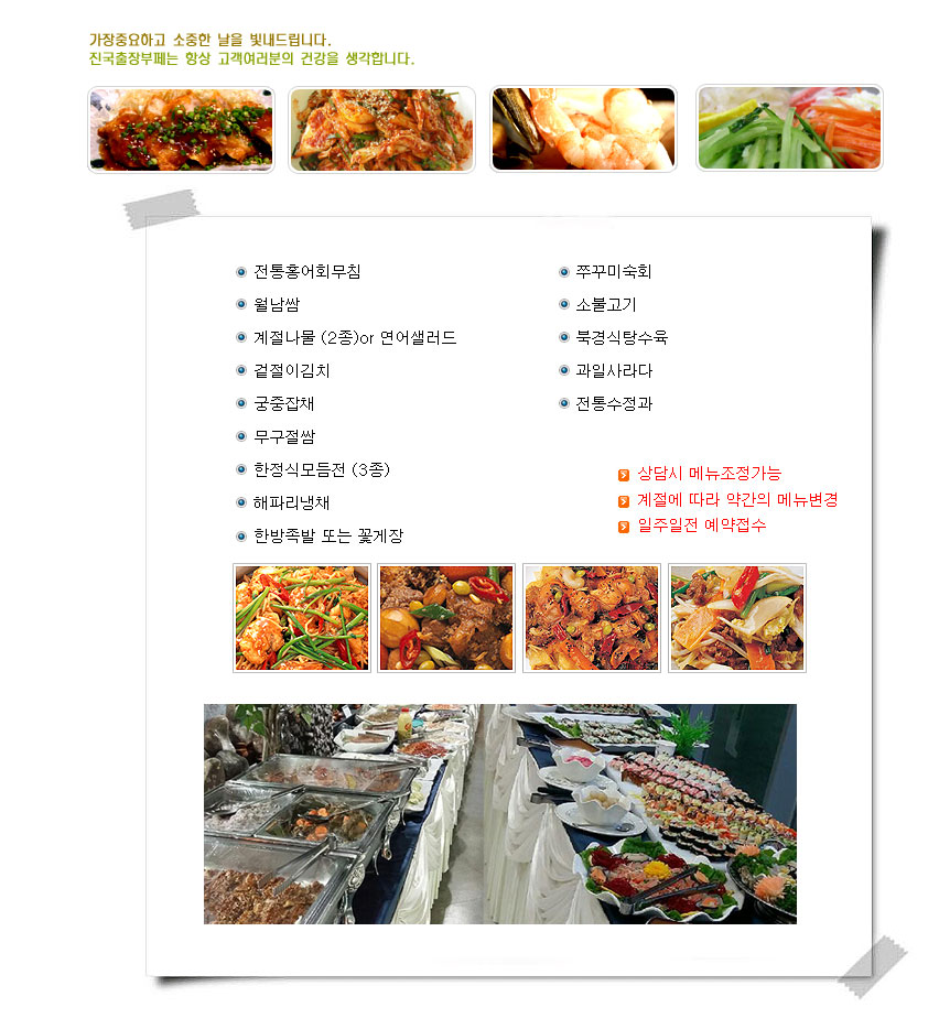 집들이, 종교모임, 돌잔치, 백일잔치, 생일, 결혼, 친목회, 회갑/칠순, 직장회식, 송/신년회, 각종 행사 등등 전화 한통화로 손님접대 끝내세요 !!!